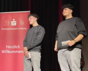 Die Referentin des Sparkassenkollegs, Frau Dr. Gertrud Rosa Traud, wurde von Ismail Benli und Alexander Breithecker, Schüler der Peter-Paul-Cahensly-Schule Limburg, vorgestellt.